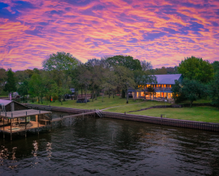 The second level includes two additional ensuite bedrooms and a game room with a wet bar, all opening to a full-length balcony overlooking the lake. The home comfortably sleeps 18+ and is designed for effortless entertaining, with expansive outdoor living on both the covered main-level patio and the upper balcony. The boathouse includes two full-size slips, a spacious covered sitting area, fish-cleaning station, composite party deck with slide, storage room, and a separate fishing pier.