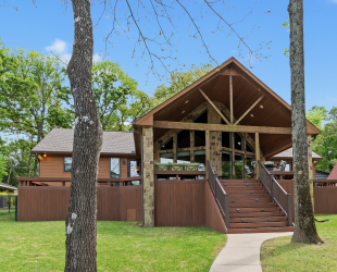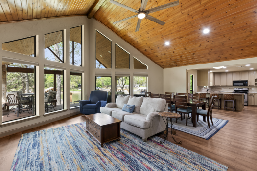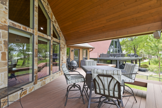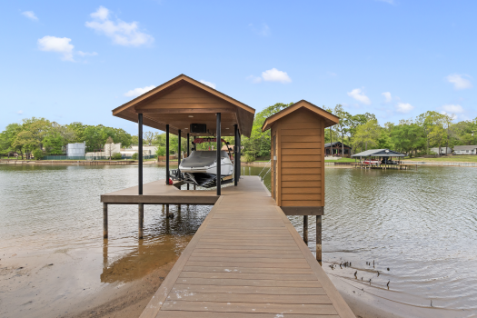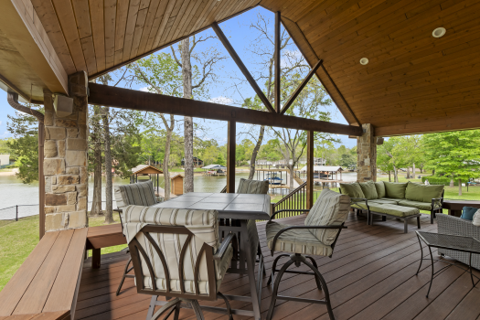 Timeless lakehouse-style home with a versatile guest house, located in a gated community offering a boat launch, park, and clubhouse. The main home features 1,715 sq ft with 4 bedrooms and 2 baths, complemented by a 1,152 sq ft guest house with 2 additional full baths and flexible living and sleeping spaces--ideal for hosting family and friends. Inside, dramatic walls of windows rise to a vaulted pine ceiling, filling the home with natural light. Recent updates include durable luxury vinyl plank flooring and a built-in bar with wine refrigerator. The stone wood-burning fireplace and kitchen with granite countertops add warmth and character, creating a comfortable, inviting atmosphere. The two-story guest house expands your options, with a spacious downstairs room featuring a full bath, wet bar, and wood-look tile flooring--perfect as a game room, bunk space, or additional living area or combination of all 3. Upstairs offers another full bath, living or sleeping space, plus two additional bedrooms. Outdoors, a generous covered deck with wood ceiling overlooks a lovely, treed yard with peaceful cove views. A detached 280 sq ft shed/garage provides ample storage for water toys and lawn equipment, while the circle drive allows for plenty of parking. The fully fenced backyard is ideal for pets and kids. A boathouse and lake fed sprinkler system complete the package--everything you need for the perfect lake getaway. The cedar-look Hardie Board siding delivers classic lakehouse charm with low-maintenance durability. New roof and gutters installed in 2025. Furnishings are included for a turnkey opportunity. Conveniently located just around the corner from Pinnacle Golf Club, where social and golf memberships are available, along with a pay-to-play option. Starlink internet available.